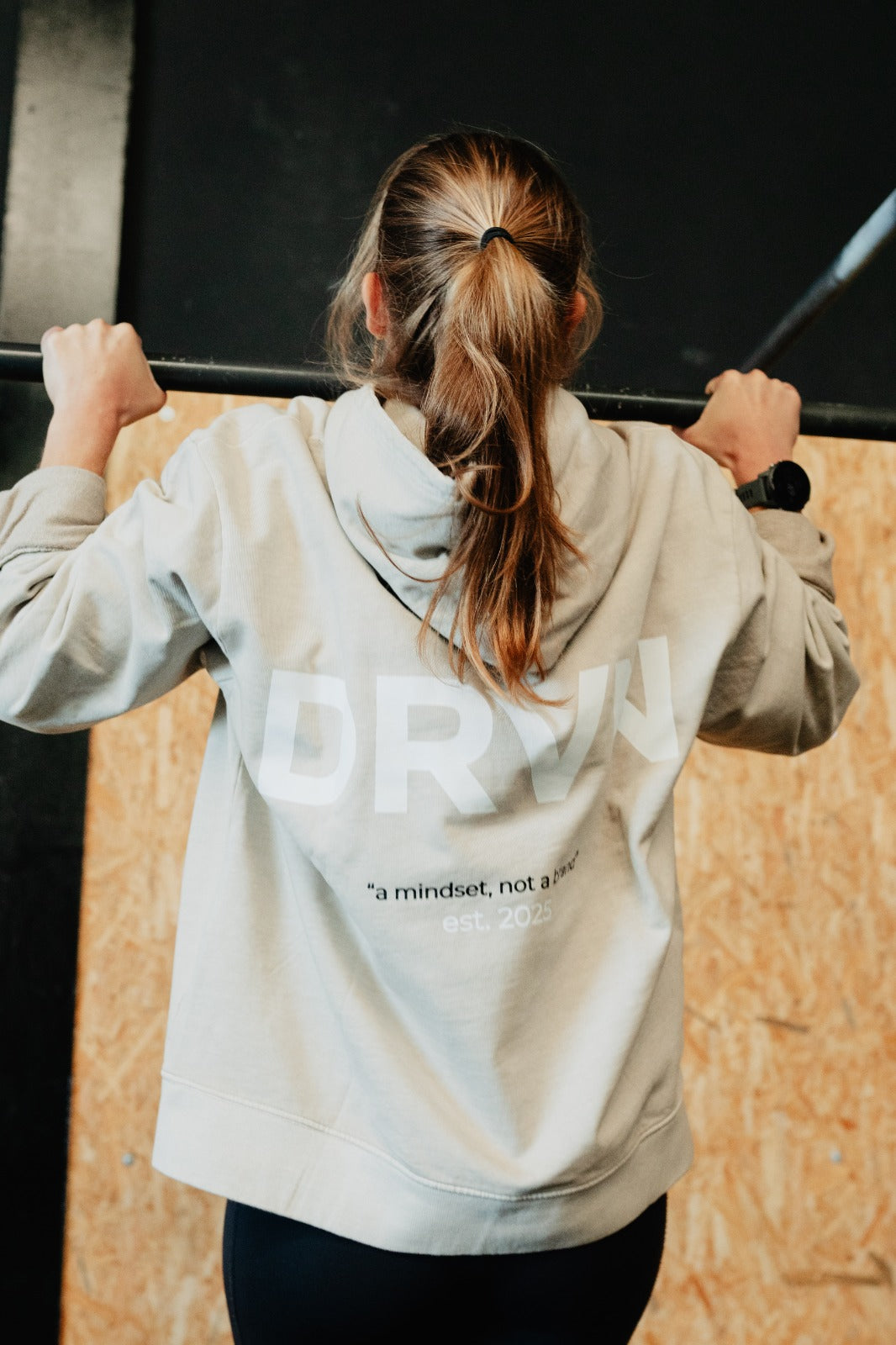 Sudadera con capucha oversized washed effect de algodón 100% lavado, con el logo DRVN Project minimalista al frente y texto "A mindset, not a brand" en la espalda.