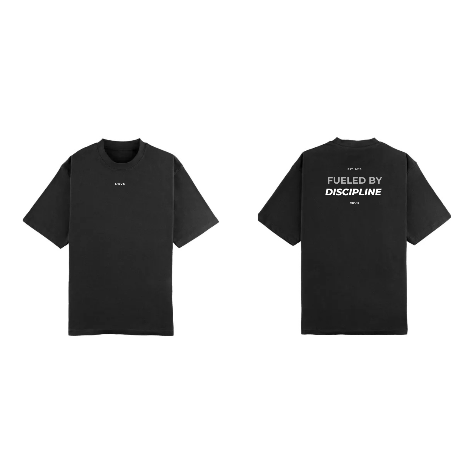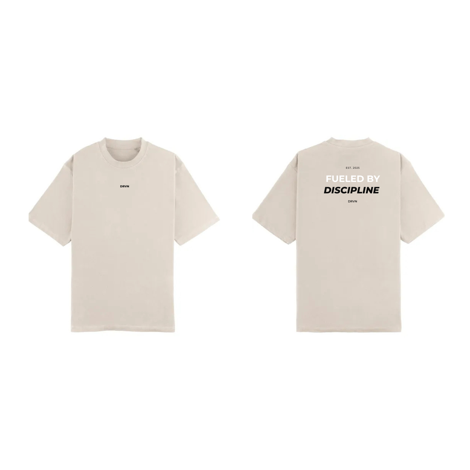 Camiseta oversized washed effect de algodón 100% lavado, con el logo DRVN minimalista al frente y texto "Fueled by discipline" en la espalda.