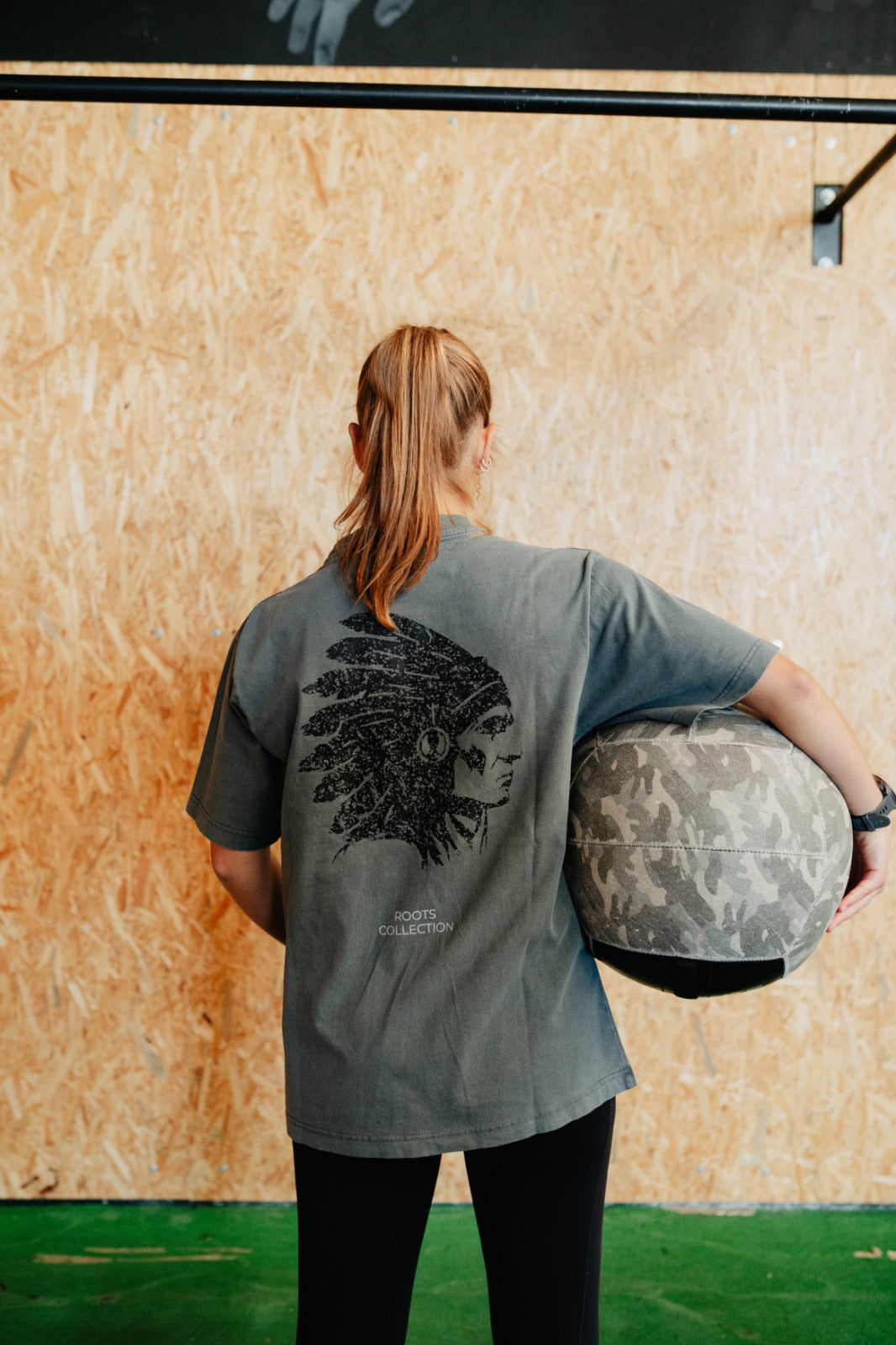 Camiseta oversized washed effect de algodón 100% lavado, con el logo DRVN minimalista al frente y texto "Roots Collection" en la espalda.