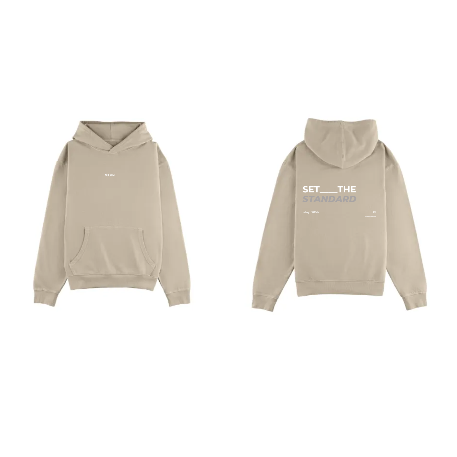 Sudadera con capucha oversized washed effect de algodón 100% lavado, con el logo DRVN minimalista al frente y texto "Set the standard" en la espalda.