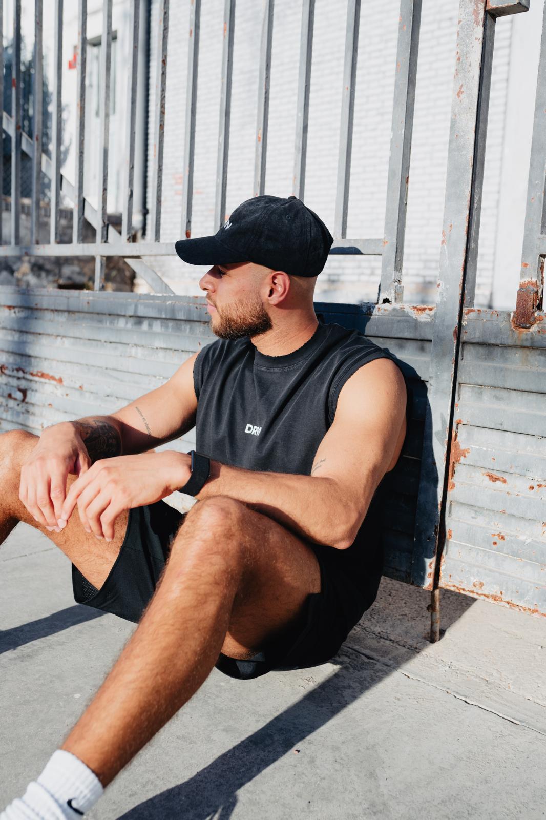 Camiseta sin mangas washed effect de algodón 100% lavado, con el logo DRVN minimalista al frente y texto "Training-Club" en la espalda.