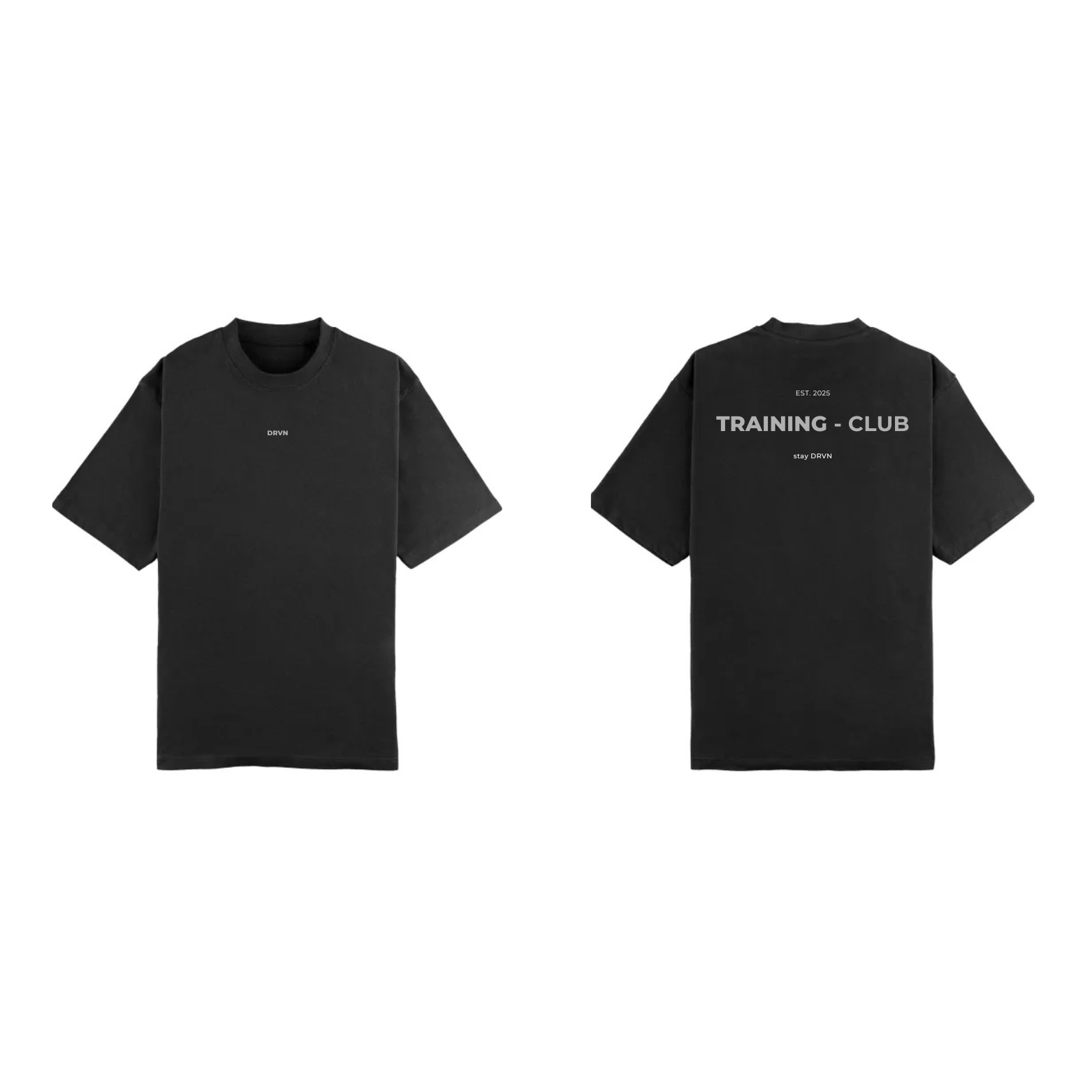 Camiseta oversized washed effect de algodón 100% lavado, con el logo DRVN minimalista al frente y texto "Training-Club" en la espalda.